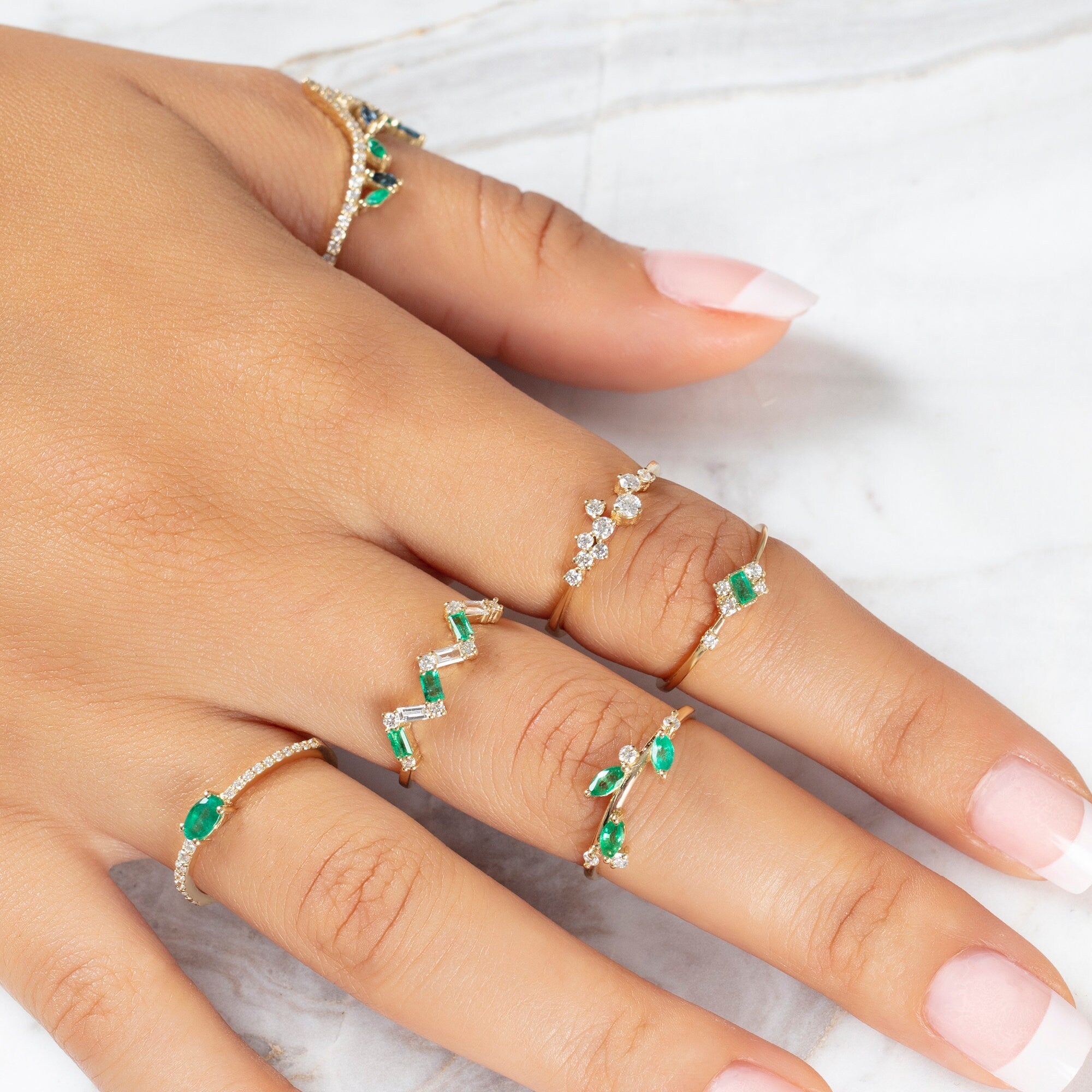 This diamond ring is adorned with diamonds along the front half of the band, and comes with 2 baguette diamonds and 6 round diamonds right in the center. Great as a solo piece and with stacking rings.