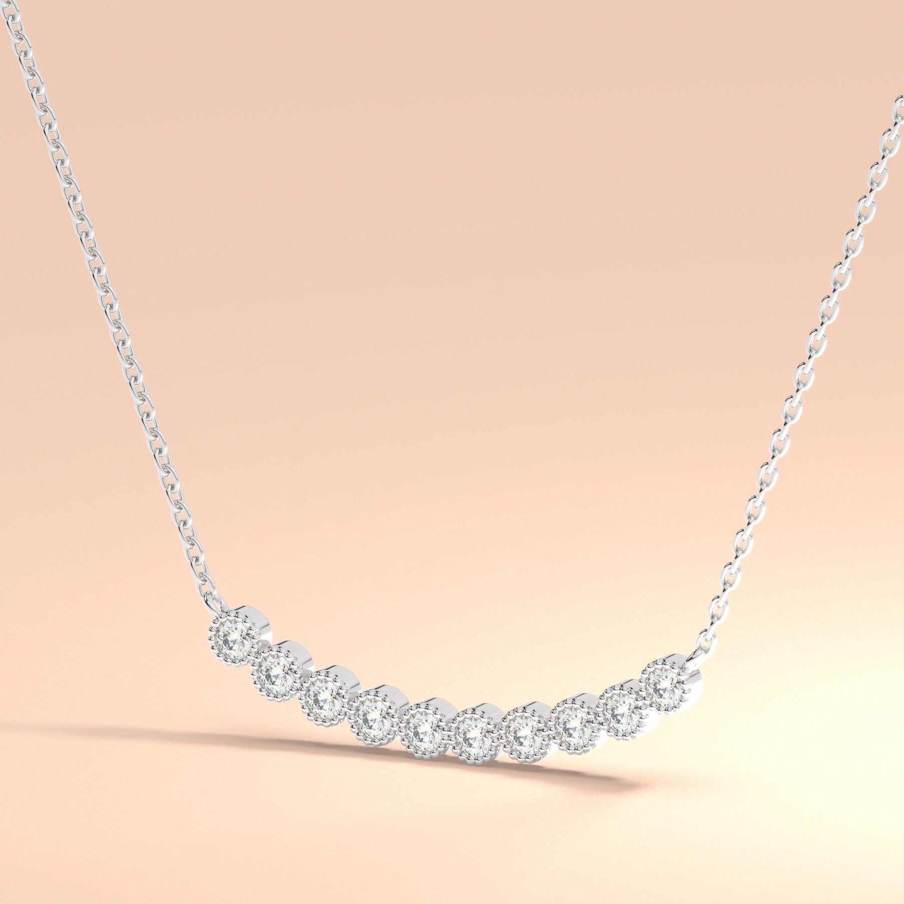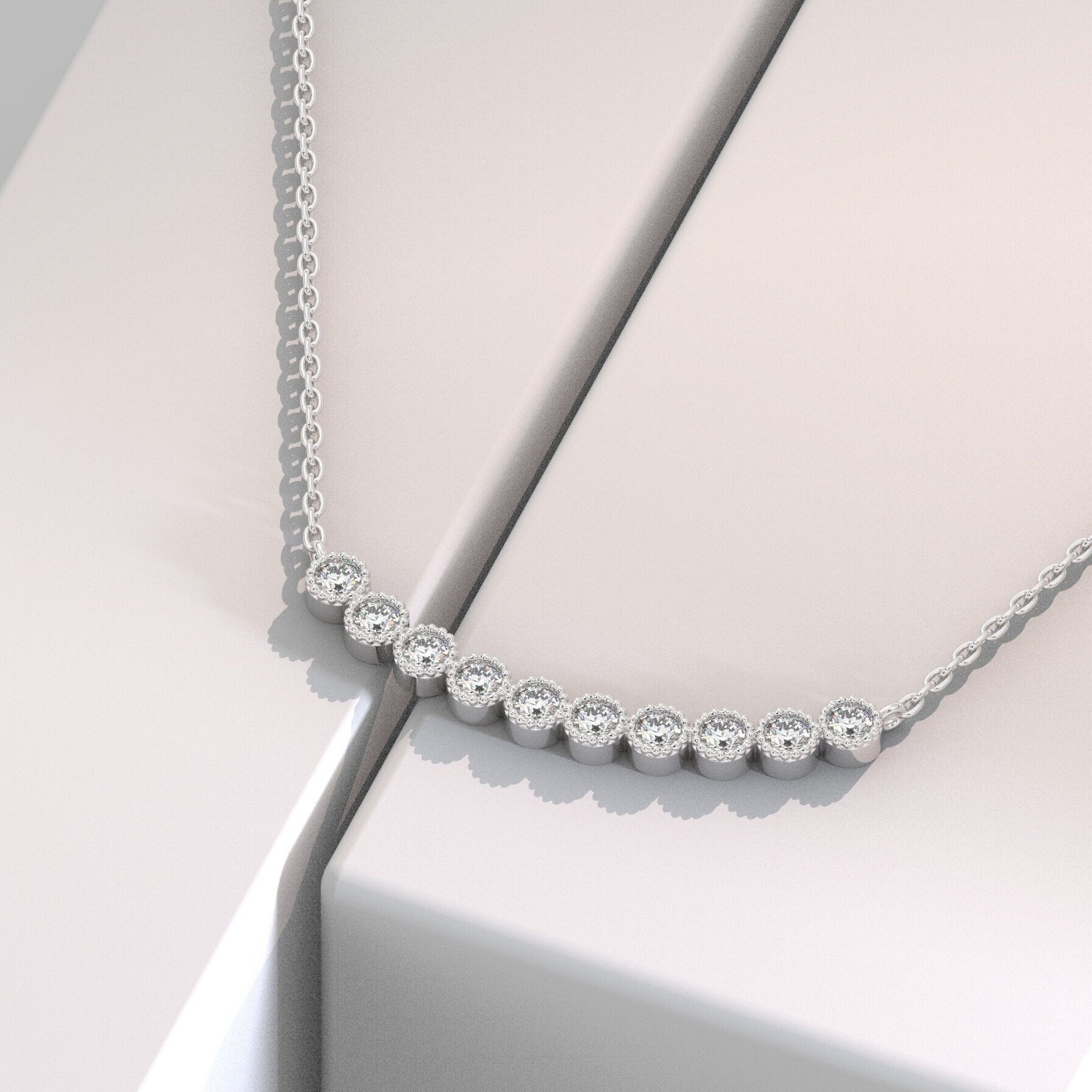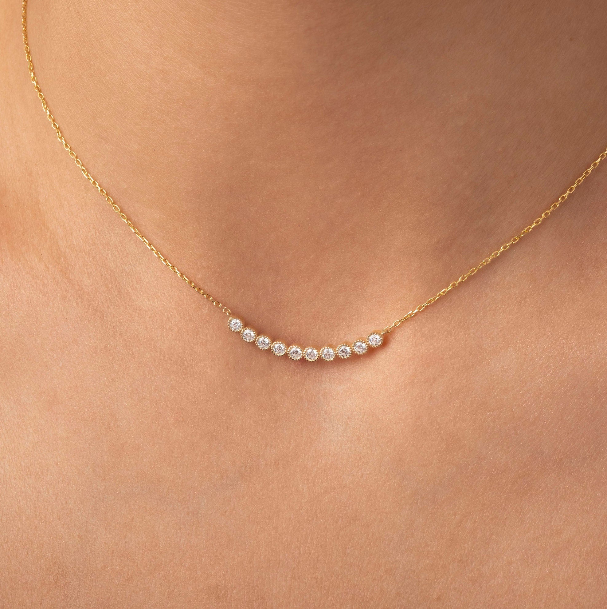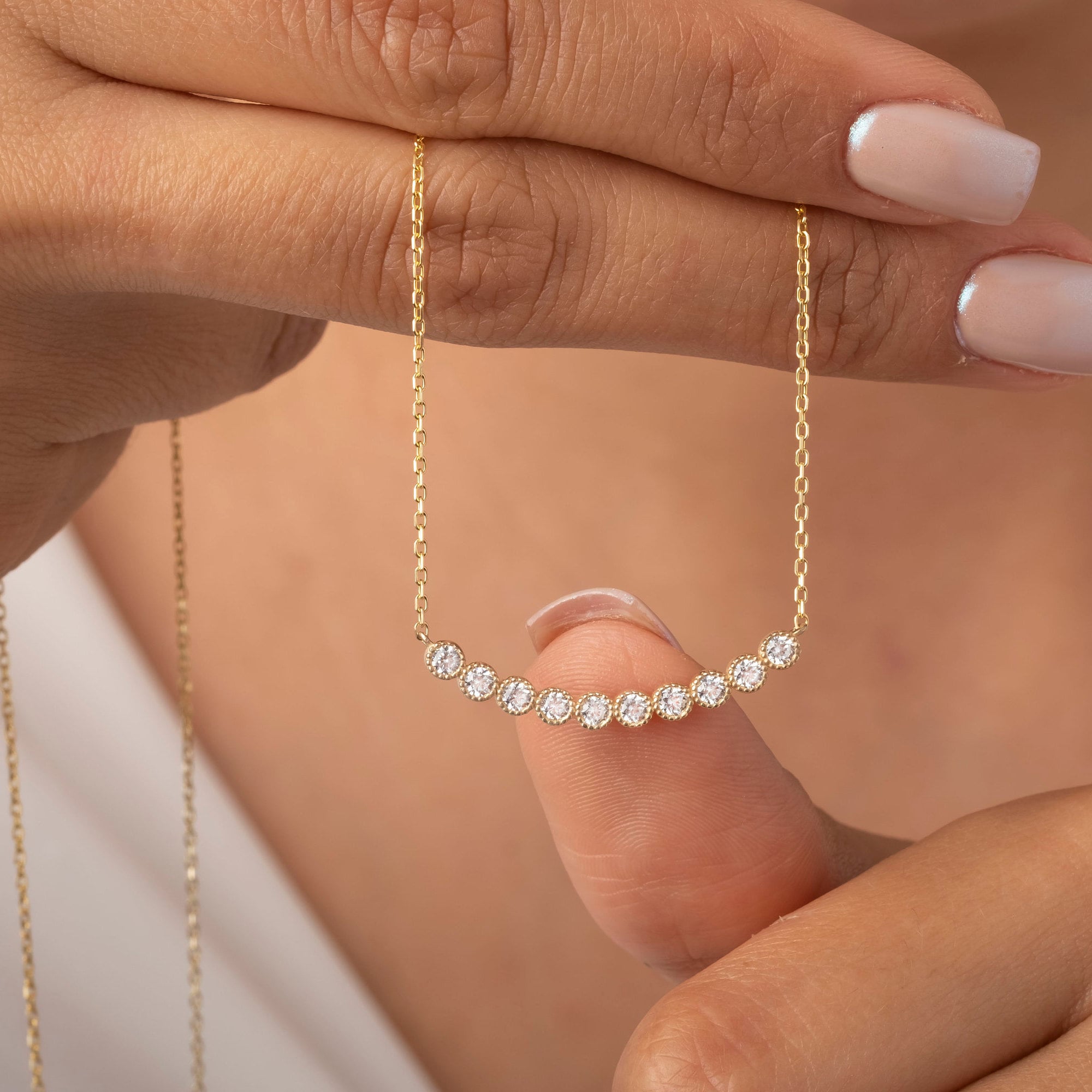 Elevate your style with our dainty 14k Curved Bar Diamond Necklace. This minimalist and handcrafted piece features a delicate bar pendant adorned with sparkling diamonds, making it the perfect wedding gift for her. Embrace the elegance and timeless beauty of this handmade diamond jewelry. Order now and make a statement of sophistication!
